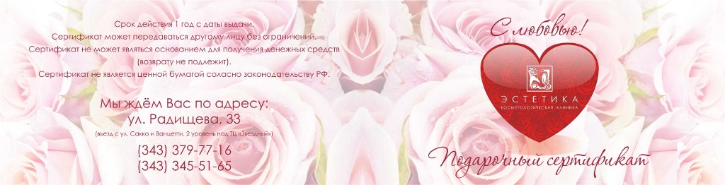 Подарочный сертификат в косметологическую клинику «Эстетика» является оптимальным решением этой проблемы. Подарочные сертификаты предоставляют своим владельцам прекрасную возможность самим выбрать себе желаемую услугу и получить ее в любое удобное время. Купить подарочный сертификат - значит, проявить максимальное внимание к виновнику торжества, преподнеся ему возможность получить именно то, что принесет огромное количество положительных эмоций и впечатлений. Ведь получив сертификат, его новый владелец сможет самостоятельно выбрать себе приглянувшуюся услугу, которая будет уже оплачена вами.